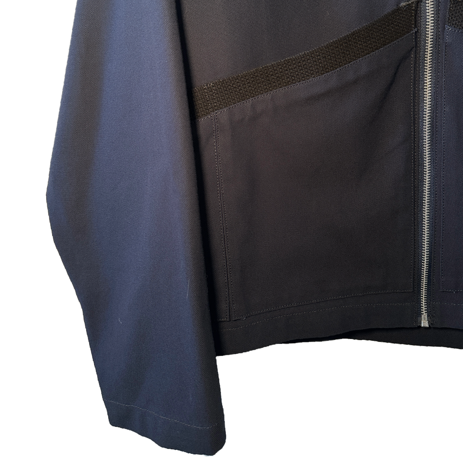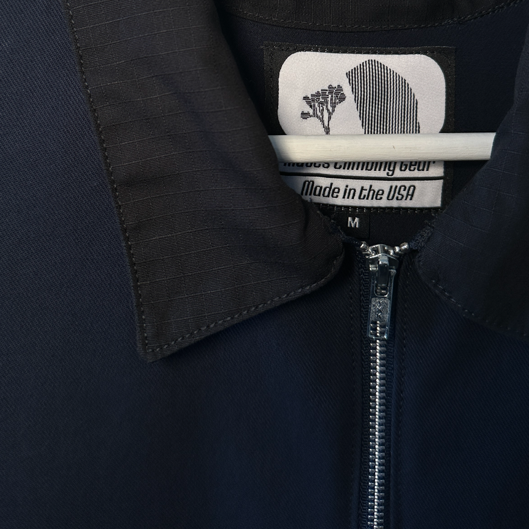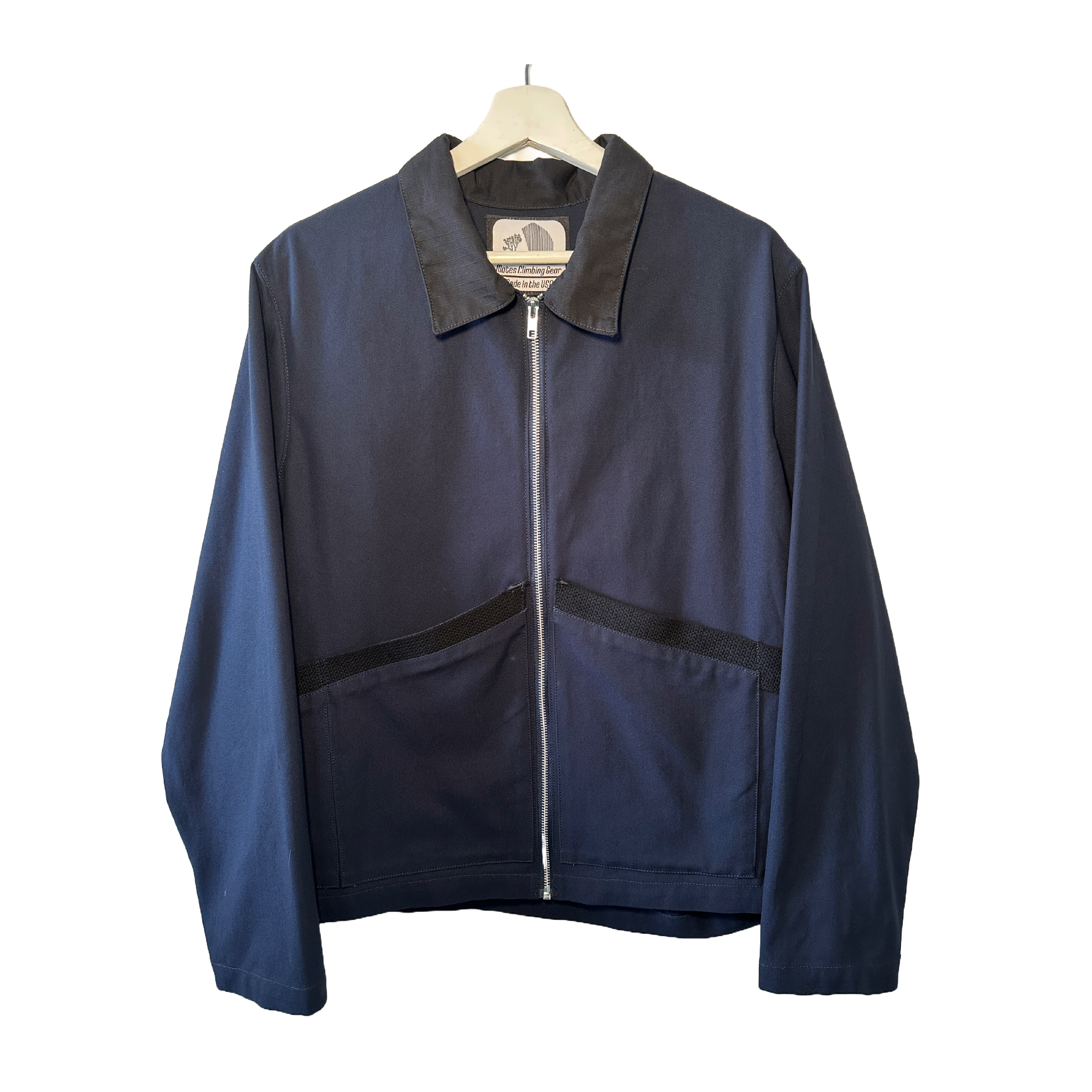 Collared jacket in cotton/viscose twill with three pocket design, strap space for clipping, and front titanium zip closure. Made in the Los Angeles, CA.