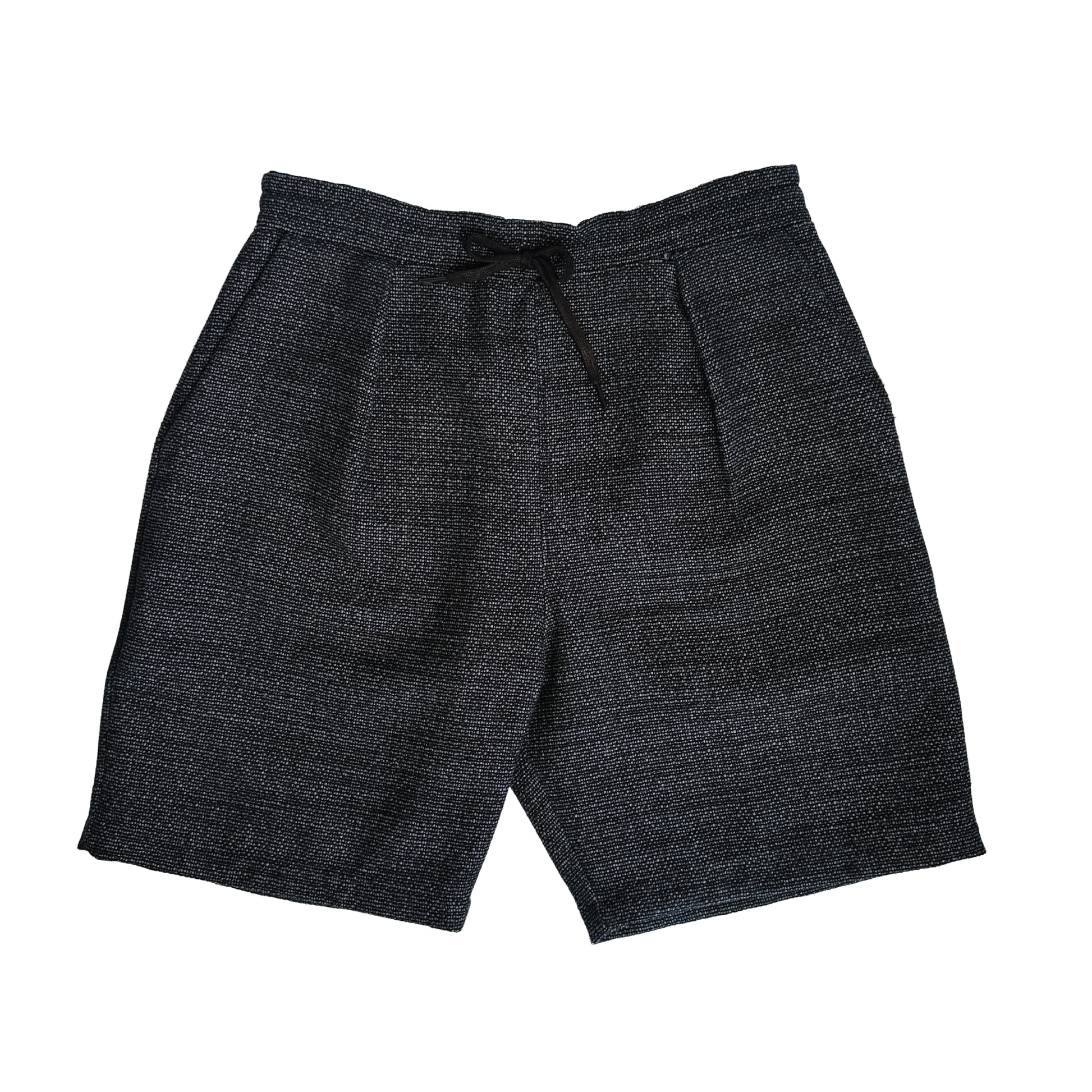Relaxed fit pleated shorts in heavyweight black and blue boucle fabric with elastic drawstring waistband, two slash pockets, rear patch pocket, and discrete zip pocket at left hip. Made in Los Angeles, CA.