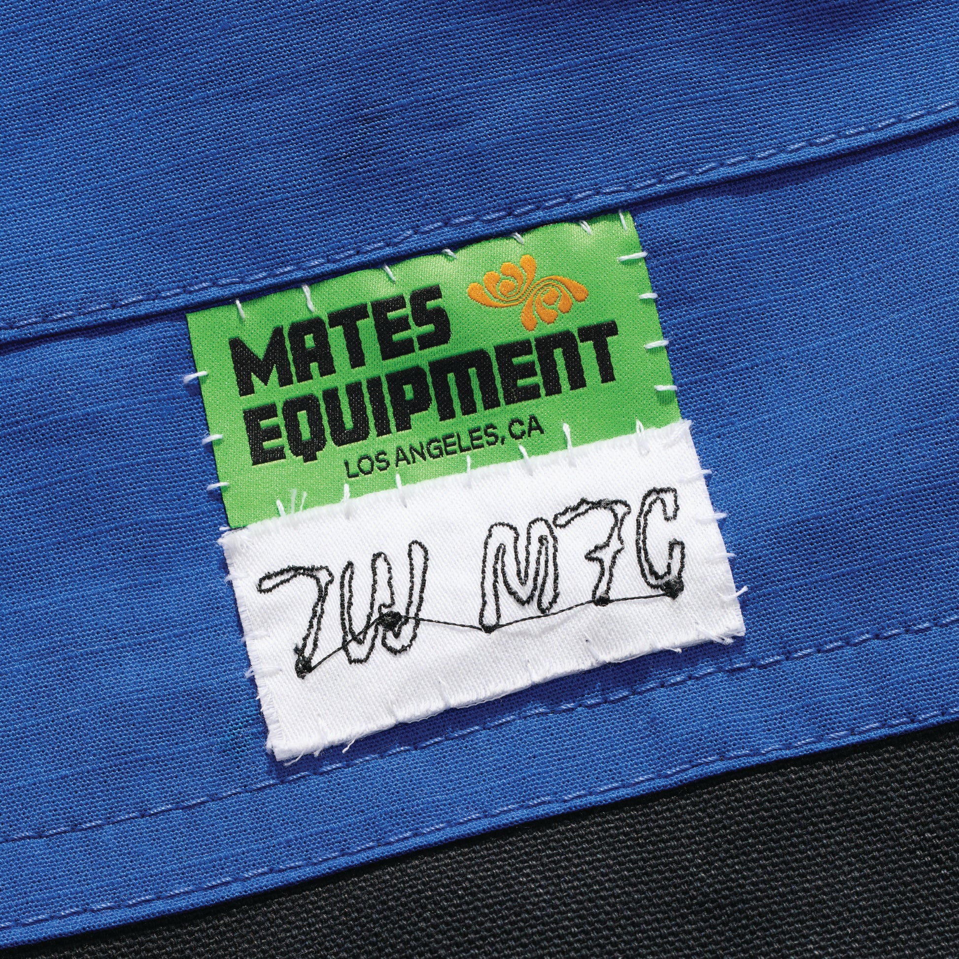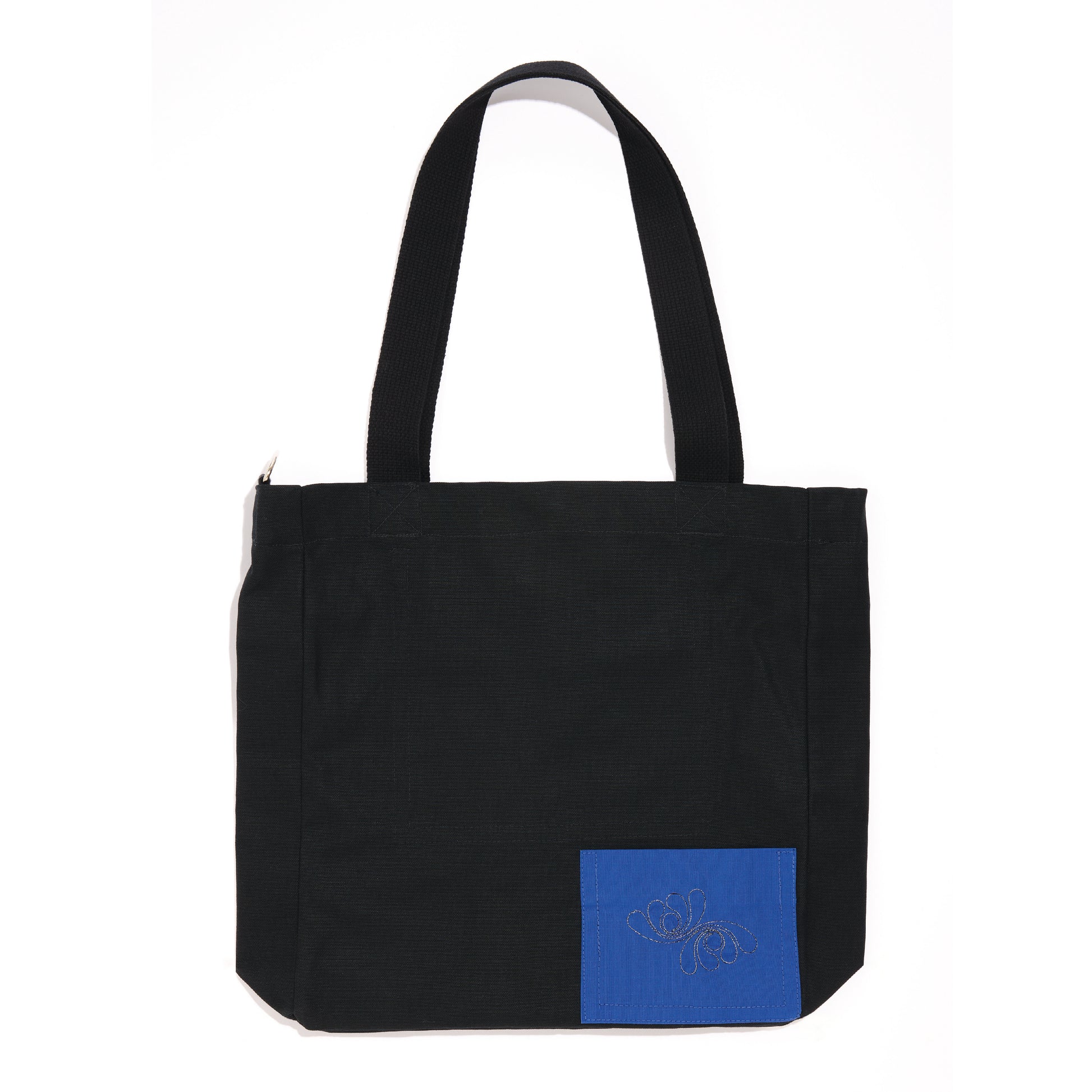 Softy structured tote bag in black organic cotton duck canvas with woven top handles, 3 inner/1 outer royal blue ripstop pockets, and reinforced bottom and side seams. Made in Los Angeles, CA.